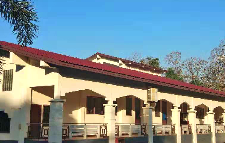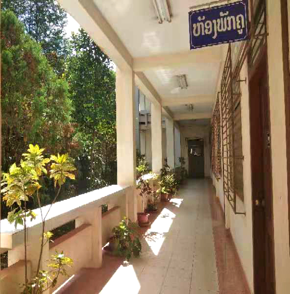 這是我上課的教學樓——語言學院,遵循著“看人先看臉”的原則,我們先看一下它的外在環(huán)境??催^前幾期介紹的小伙伴不難發(fā)現(xiàn),老撾國立大學的教學樓基本都是紅頂白墻,活潑跳躍的顏色彰顯著這所學校的朝氣。