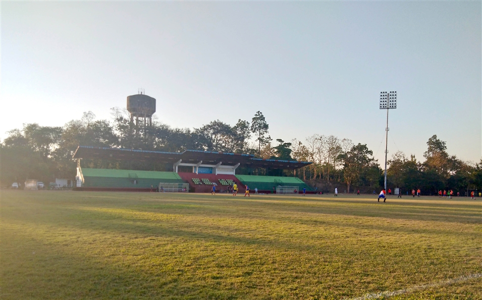 老撾國立大學(xué)的同學(xué)就很喜歡踢足球,足球場在學(xué)校的東面,球場正面是主席臺,側(cè)面還設(shè)有一處看臺,大約可以容納270名觀眾。跑道一圈也是400米,占地面積很大。球場中間的草是真草,有專門的人員養(yǎng)護(hù)。