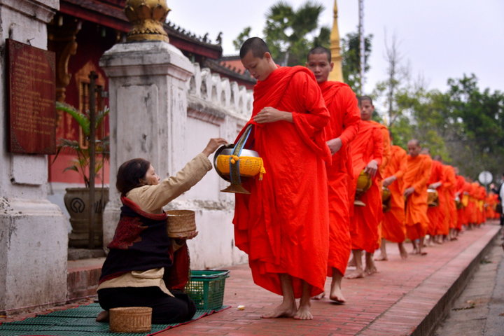 在老撾的許多地方,布施是一道獨(dú)特的風(fēng)景。每天拂曉,僧人們會(huì)離開寺院,身披橙色袈裟,結(jié)隊(duì)到街道上或村莊里化齋。虔誠(chéng)的佛教徒跪在道路的一邊,雙掌合十,接受僧侶誦經(jīng)祝福。誦經(jīng)完畢,僧侶們排著隊(duì)伍依次從人們的面前赤腳行過,人們把米飯、餅干、水果、雞肉等食物放進(jìn)僧人們的竹編小籃中。這些食品,就是僧人們一天的口糧。