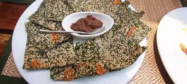 老撾是東南亞唯一的內陸國,海產(chǎn)品相對周邊鄰國少了很多,可是流經(jīng)老撾的湄公河盛產(chǎn)河苔,是一道著名的下酒菜。這道菜的老撾名叫Khai Paen,將河苔片下油鍋炸至酥脆后撒上芝麻,搭配檸檬草、花生、蘸醬等一起吃,味道極其鮮美。