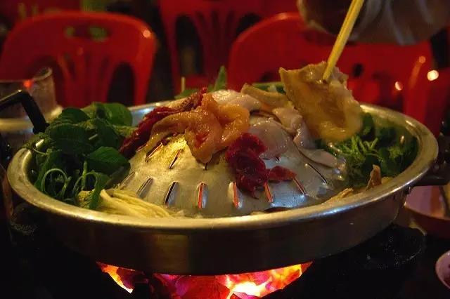 老式火鍋為涮烤兩吃,跟中式火鍋還是有很大區(qū)別的?;疱伒男螤罡褚粋€有沿兒的平底鍋,中間高高鼓起,可用于燒烤,周圍盛湯用于涮煮,還有大廚現(xiàn)場烤制的大蝦、生蠔、牛肉串等食物,配上一瓶老撾啤酒,盡享美食。