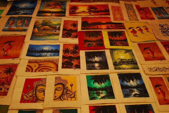 老撾原生態(tài)的手工藝造紙非常有名,也是在市場上最常見的一種工藝品,包括紙畫、紙燈罩、名信片、筆記本等種類。這種紙質藝術品的繪畫內容多與佛教有關,極具老撾特色。
