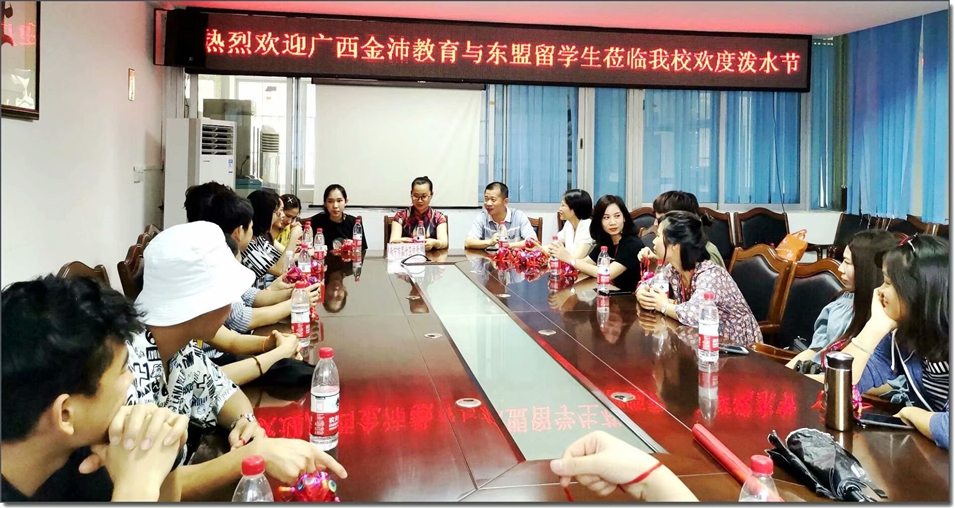南寧市第十五中學(xué)盧副校長(zhǎng)及譚主任親自到校門(mén)迎接并在會(huì)議室熱情接待了大家。在歡迎會(huì)上,盧副校長(zhǎng)向東盟各國(guó)留學(xué)生介紹了學(xué)校概況并送上壯族特色的繡球表示歡迎。南寧市第十五中學(xué)是東盟文化相融合的特色高中,至此高考來(lái)臨之際,為增進(jìn)師生互動(dòng),緩解高三學(xué)子的考試壓力,學(xué)校以東盟特色的潑水方式傳遞祝福、共同祈愿,同時(shí)也為中國(guó)學(xué)生與留學(xué)生提供了一個(gè)文化交流平臺(tái)。