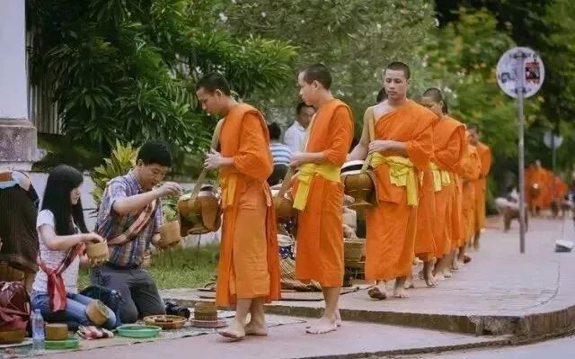 每天清晨六點,一列列身穿黃色袈裟的僧人在寺廟住持的帶引下,赤腳圍著古城轉(zhuǎn)一圈,接受小城里人們的布施,然后駐足誦經(jīng)為他們祝福。