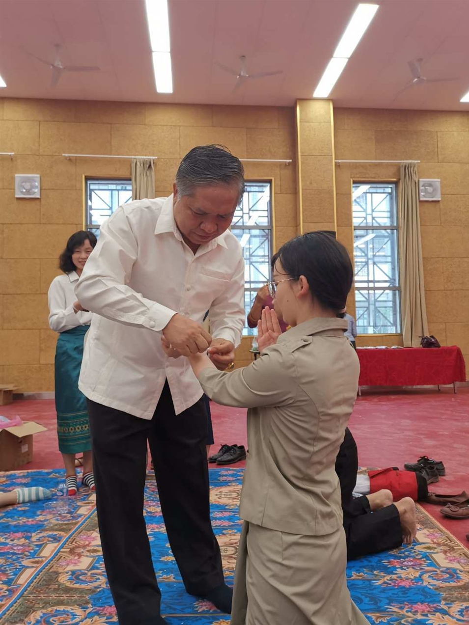 (老撾國立大學(xué)校長宋西.諾潘塞在給老師栓線祝福)