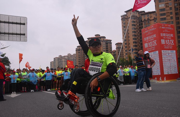 在眾多的選手中,坐在輪椅上的張先生顯得尤為搶眼。張先生來(lái)自廣州,他告訴記者,這是他參加的第54場(chǎng)馬拉松比賽,也是第一次參加全海景跑道的馬拉松, “我參加比賽不是為了出成績(jī)或出風(fēng)頭,而是重在參與,是想體現(xiàn)一種精神?!睆埾壬f(shuō),他不一定能全部“跑”完全程,但他一定會(huì)堅(jiān)持到最后。