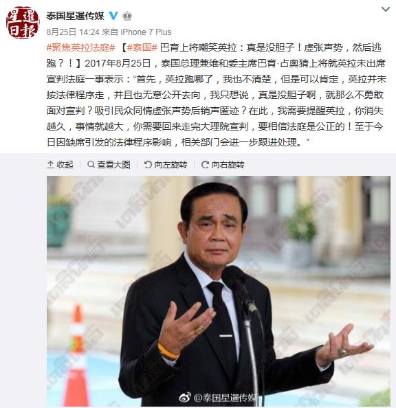 【環(huán)球網(wǎng)綜合報道】泰國前總理英拉卷入大米收購瀆職案,原定周五(25日)在最高法院判刑,但英拉當(dāng)日未有出庭,去向成謎。法新社26日引述泰國軍政府人士的消息稱,英拉現(xiàn)時身處阿聯(lián)酋迪拜,很有可能前往英國尋求政治庇護。