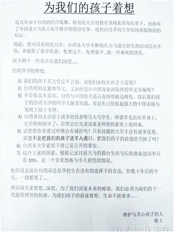公開信同時列舉臺灣升學七大弊端,其中第二點是,“臺灣用的是繁體華文,又如何適應中國及亞洲簡體的華文市場呢?”第三點是“不管你喜不喜歡,臺灣與中國的關系只有繼續(xù)被邊緣化。以后我們孩子的臺灣大學的同學人脈及資源,肯定在已經崛起強大的中國市場與發(fā)展上處于劣勢”。第七點提出臺灣升學弊端的結論是,“大馬留臺學生回到馬來西亞后,就業(yè)率只有10%,是一個非常恐怖與令人擔憂的情況”。